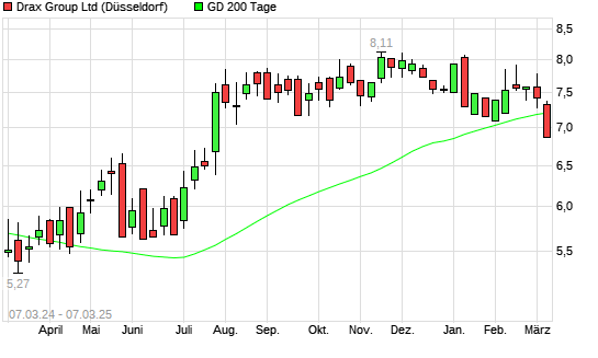 Mit dem Rücksetzer auf 6,94 EUR hat die DRAX GROUP-Aktie am 06.03.2025 die 200-Tage-Linie nach unten gekreuzt.