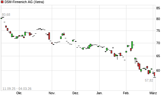 Mit dem Rücksetzer auf 58,32 EUR hat die DSM-Firmenich-Aktie (ISIN CH1216478797) am 03.03.2026 ein neues All-Time-Low erreicht und damit den Kurs vom 25.02.2026 eingestellt.