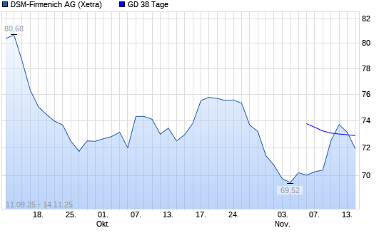 Mit dem Rücksetzer auf 72,64 EUR hat die DSM-Firmenich-Aktie am 13.11.2025 die 38-Tage-Linie nach unten gekreuzt.