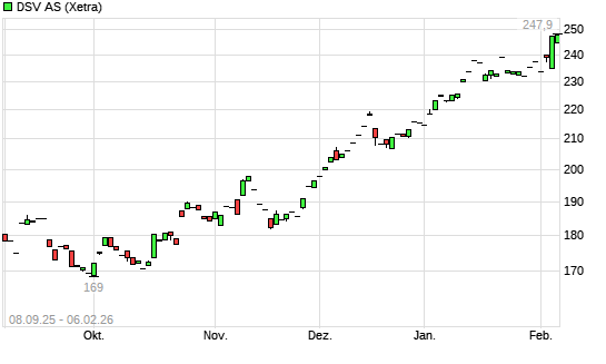 Mit dem Anstieg auf 246,10 EUR hat die DSV-Aktie (ISIN DK0060079531) am 05.02.2026 ein neues All-Time-High erreicht und damit den Kurs vom 22.01.2026 eingestellt.