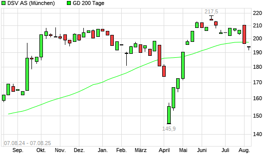 Mit dem Anstieg auf 196,45 EUR hat die DSV-Aktie am 06.08.2025 die 200-Tage-Linie nach oben gekreuzt.