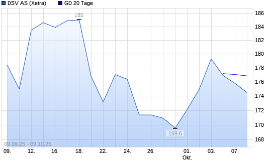 Mit dem Rücksetzer auf 175,20 EUR hat die DSV-Aktie am 08.10.2025 die 20-Tage-Linie nach unten gekreuzt.