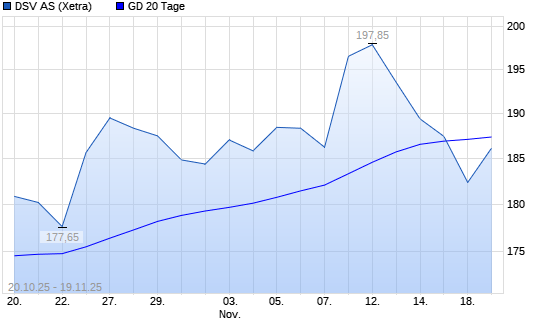 Mit dem Rücksetzer auf 183,80 EUR hat die DSV-Aktie am 18.11.2025 die 20-Tage-Linie nach unten gekreuzt.