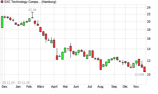 Mit dem Rücksetzer auf 10,44 EUR hat die DXC Technology-Aktie (ISIN US23355L1061) am 19.11.2025 ein neues 5-Jahres-Tief erreicht und damit den Kurs vom 18.11.2025 eingestellt.