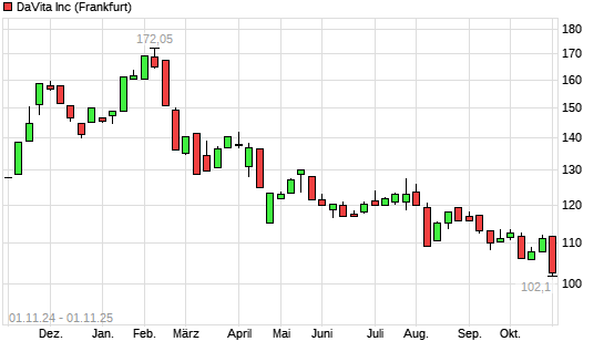 Mit dem Rücksetzer auf 102,65 EUR hat die DaVita-Aktie (ISIN US23918K1088) am 31.10.2025 ein neues 12-Monats-Tief erreicht und damit den Kurs vom 30.10.2025 eingestellt.