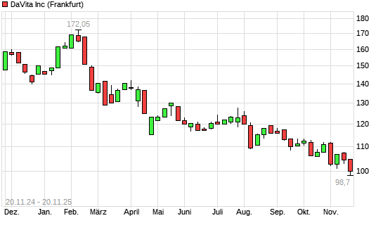 Mit dem Rücksetzer auf 100,10 EUR hat die DaVita-Aktie (ISIN US23918K1088) am 19.11.2025 ein neues 12-Monats-Tief erreicht und damit den Kurs vom 18.11.2025 eingestellt.