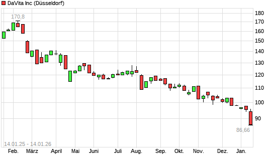 Mit dem Rücksetzer auf 89,58 EUR hat die DaVita-Aktie (ISIN US23918K1088) am 13.01.2026 ein neues 12-Monats-Tief erreicht und damit den Kurs vom 12.01.2026 eingestellt.