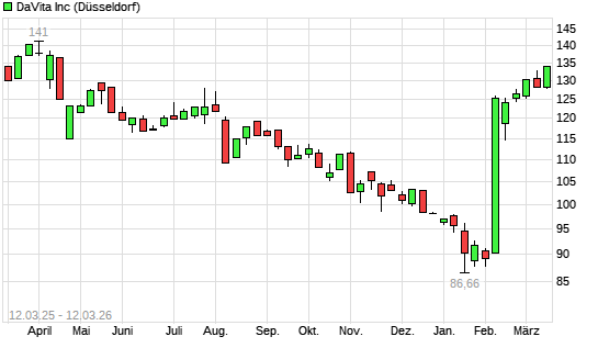 Mit dem Anstieg auf 133,15 EUR hat die DaVita-Aktie (ISIN US23918K1088) am 11.03.2026 ein neues 6-Monats-Hoch erreicht und damit den Kurs vom 04.03.2026 eingestellt.