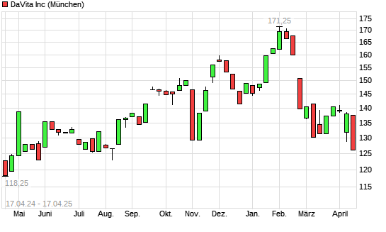 Mit dem Rücksetzer auf 125,00 EUR hat die DaVita-Aktie (ISIN US23918K1088) am 16.04.2025 ein neues 6-Monats-Tief erreicht und damit den Kurs vom 01.11.2024 eingestellt.