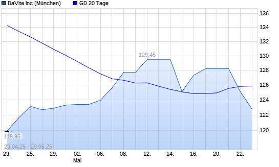 Mit dem Rücksetzer auf 123,65 EUR hat die DaVita-Aktie am 22.05.2025 die 20-Tage-Linie nach unten gekreuzt.