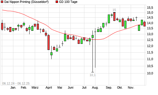 Mit dem Rücksetzer auf 13,80 EUR hat die Dai Nippon Printing-Aktie am 05.12.2025 die 100-Tage-Linie nach unten gekreuzt.