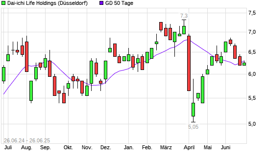 Mit dem Rücksetzer auf 6,25 EUR hat die Dai-ichi Life-Aktie am 25.06.2025 die 50-Tage-Linie nach unten gekreuzt.