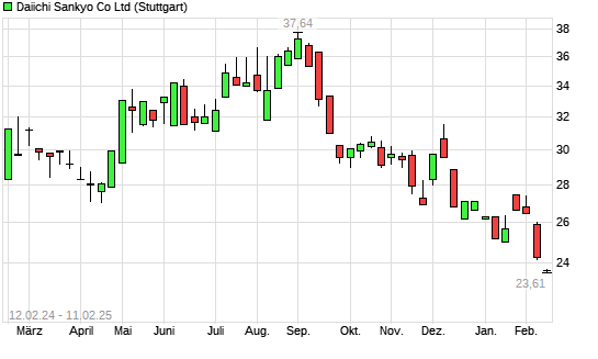 Mit dem Rücksetzer auf 23,69 EUR hat die Daiichi Sankyo-Aktie (ISIN JP3475350009) am 10.02.2025 ein neues 12-Monats-Tief erreicht und damit den Kurs vom 07.02.2025 eingestellt.