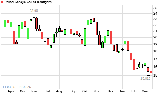 Mit dem Rücksetzer auf 15,20 EUR hat die Daiichi Sankyo-Aktie (ISIN JP3475350009) am 13.03.2026 ein neues 3-Jahres-Tief erreicht und damit den Kurs vom 06.02.2026 eingestellt.