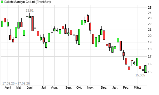 Mit dem Rücksetzer auf 15,01 EUR hat die Daiichi Sankyo-Aktie (ISIN JP3475350009) am 16.03.2026 ein neues 5-Jahres-Tief erreicht und damit den Kurs vom 06.08.2021 eingestellt.