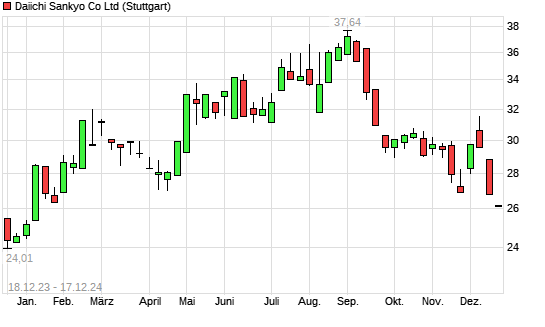 Mit dem Rücksetzer auf 26,00 EUR hat die Daiichi Sankyo-Aktie (ISIN JP3475350009) am 16.12.2024 ein neues 6-Monats-Tief erreicht und damit den Kurs vom 13.12.2024 eingestellt.