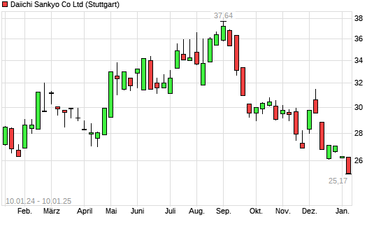 Mit dem Rücksetzer auf 25,35 EUR hat die Daiichi Sankyo-Aktie (ISIN JP3475350009) am 09.01.2025 ein neues 6-Monats-Tief erreicht und damit den Kurs vom 16.12.2024 eingestellt.