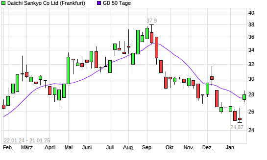 Mit dem Anstieg auf 27,70 EUR hat die Daiichi Sankyo-Aktie am 20.01.2025 die 50-Tage-Linie nach oben gekreuzt.