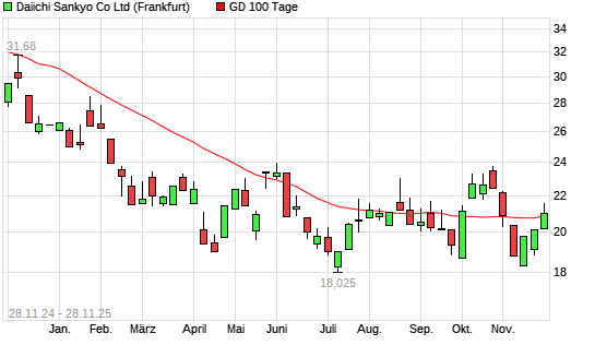 Mit dem Rücksetzer auf 20,74 EUR hat die Daiichi Sankyo-Aktie am 27.11.2025 die 100-Tage-Linie nach unten gekreuzt.