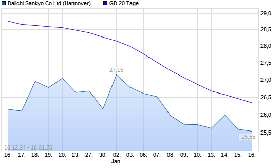 Mit dem Rücksetzer auf 25,67 EUR hat die Daiichi Sankyo-Aktie am 15.01.2025 die 20-Tage-Linie nach unten gekreuzt.