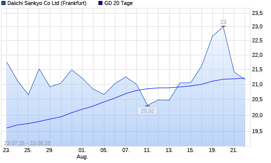 Mit dem Rücksetzer auf 21,16 EUR hat die Daiichi Sankyo-Aktie am 22.08.2025 die 20-Tage-Linie nach unten gekreuzt.