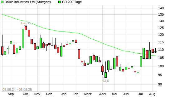 Mit dem Anstieg auf 111,35 EUR hat die Daikin Industries-Aktie am 04.08.2025 die 200-Tage-Linie nach oben gekreuzt.