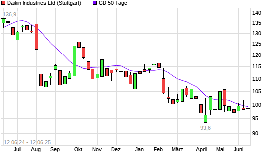 Mit dem Rücksetzer auf 99,08 EUR hat die Daikin Industries-Aktie am 11.06.2025 die 50-Tage-Linie nach unten gekreuzt.
