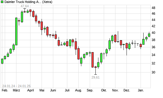 Mit dem Anstieg auf 39,78 EUR hat die Daimler Truck-Aktie (ISIN DE000DTR0CK8) am 23.01.2025 ein neues 6-Monats-Hoch erreicht und damit den Kurs vom 20.01.2025 eingestellt.