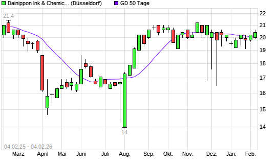 Mit dem Anstieg auf 20,40 EUR hat die Dainippon Ink & Chemicals-Aktie am 03.02.2026 die 50-Tage-Linie nach oben gekreuzt.