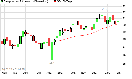 Mit dem Rücksetzer auf 20,40 EUR hat die Dainippon Ink & Chemicals-Aktie am 03.02.2025 die 100-Tage-Linie nach unten gekreuzt.