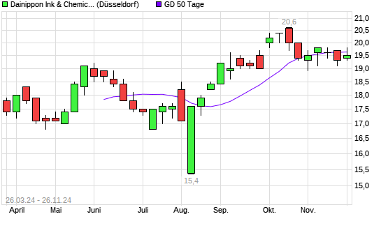 Mit dem Rücksetzer auf 19,70 EUR hat die Dainippon Ink & Chemicals-Aktie am 25.11.2024 die 50-Tage-Linie nach unten gekreuzt.