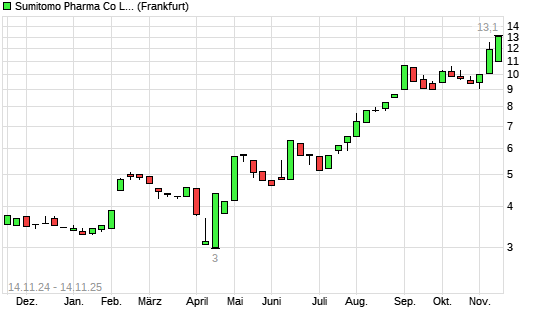 Mit dem Anstieg auf 12,80 EUR hat die Dainippon Sumitomo Pharma-Aktie (ISIN JP3495000006) am 13.11.2025 ein neues 3-Jahres-Hoch erreicht und damit den Kurs vom 05.11.2025 eingestellt.