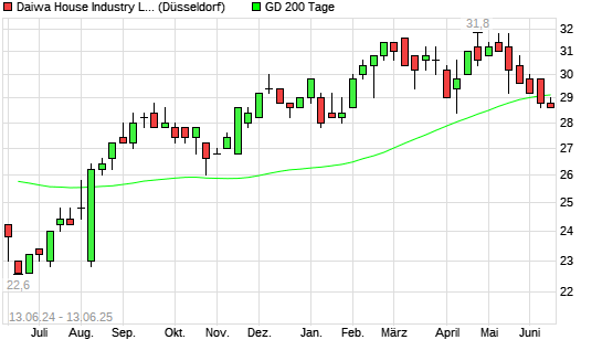 Mit dem Rücksetzer auf 28,80 EUR hat die Daiwa House Industry-Aktie am 12.06.2025 die 200-Tage-Linie nach unten gekreuzt.