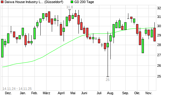 Mit dem Rücksetzer auf 29,60 EUR hat die Daiwa House Industry-Aktie am 13.11.2025 die 200-Tage-Linie nach unten gekreuzt.