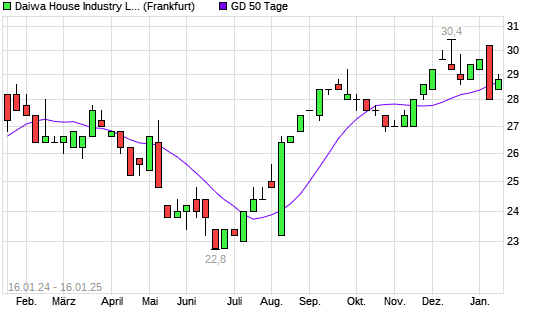Mit dem Rücksetzer auf 28,40 EUR hat die Daiwa House Industry-Aktie am 15.01.2025 die 50-Tage-Linie nach unten gekreuzt.