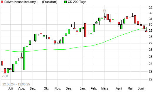 Mit dem Anstieg auf 29,60 EUR hat die Daiwa House Industry-Aktie am 11.06.2025 die 200-Tage-Linie nach oben gekreuzt.Die Daiwa House Industry-Aktie befand sich seit dem 05.06.2025 im langfristigen ...weiterlesen