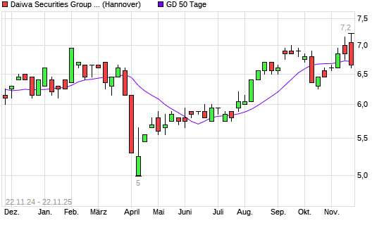 Mit dem Anstieg auf 6,65 EUR hat die Daiwa Securities Group-Aktie am 21.11.2025 die 50-Tage-Linie nach oben gekreuzt.