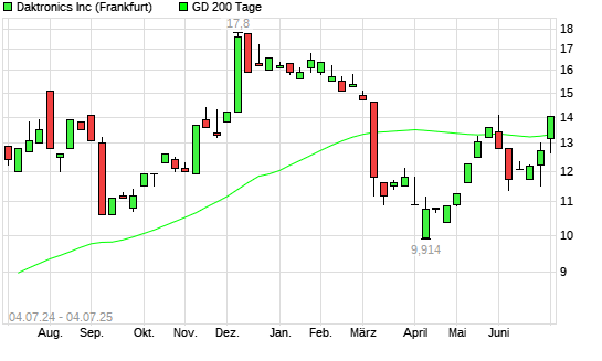 Mit dem Anstieg auf 13,77 EUR hat die Daktronics-Aktie am 03.07.2025 die 200-Tage-Linie nach oben gekreuzt.