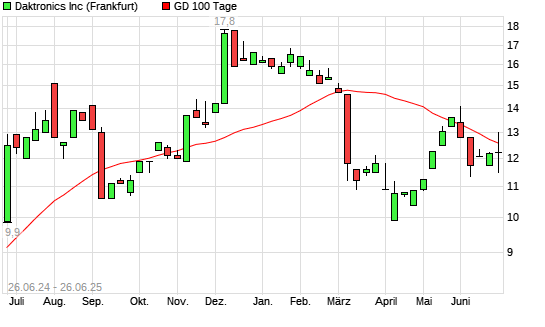 Mit dem Rücksetzer auf 11,50 EUR hat die Daktronics-Aktie am 25.06.2025 die 100-Tage-Linie nach unten gekreuzt.