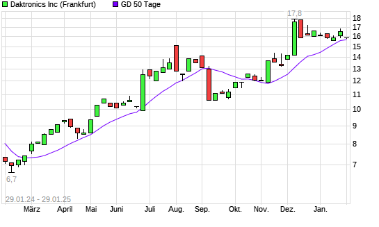 Mit dem Rücksetzer auf 15,80 EUR hat die Daktronics-Aktie am 28.01.2025 die 50-Tage-Linie nach unten gekreuzt.