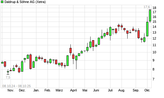 Mit dem Anstieg auf 16,00 EUR hat die Daldrup & Söhne-Aktie (ISIN DE0007830572) am 07.10.2025 ein neues 10-Jahres-Hoch erreicht und damit den Kurs vom 06.10.2025 eingestellt.