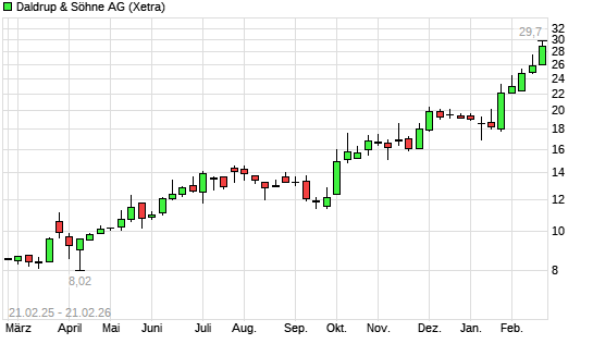 Mit dem Anstieg auf 29,10 EUR hat die Daldrup & Söhne-Aktie (ISIN DE0007830572) am 20.02.2026 ein neues 10-Jahres-Hoch erreicht und damit den Kurs vom 17.02.2026 eingestellt.