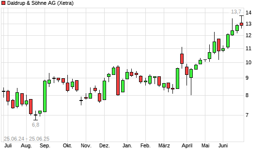 Mit dem Anstieg auf 13,10 EUR hat die Daldrup & Söhne-Aktie (ISIN DE0007830572) am 24.06.2025 ein neues 12-Monats-Hoch erreicht und damit den Kurs vom 12.06.2025 eingestellt.