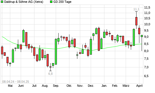 Mit dem Rücksetzer auf 8,00 EUR hat die Daldrup & Söhne-Aktie am 07.04.2025 die 200-Tage-Linie nach unten gekreuzt.