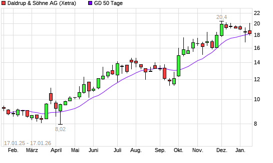 Mit dem Rücksetzer auf 18,15 EUR hat die Daldrup & Söhne-Aktie am 16.01.2026 die 50-Tage-Linie nach unten gekreuzt.