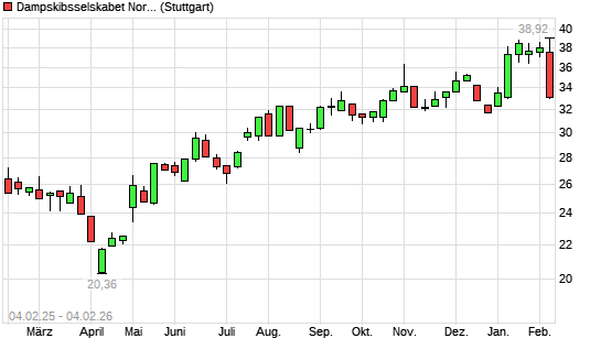 Mit dem Anstieg auf 38,78 EUR hat die Dampskibsselskabet Norden-Aktie (ISIN DK0060083210) am 03.02.2026 ein neues 12-Monats-Hoch erreicht und damit den Kurs vom 15.01.2026 eingestellt.