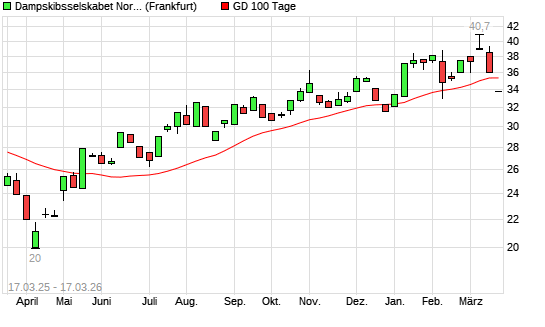 Mit dem Rücksetzer auf 33,78 EUR hat die Dampskibsselskabet Norden-Aktie am 16.03.2026 die 100-Tage-Linie nach unten gekreuzt.