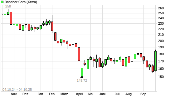 Mit dem Anstieg auf 185,08 EUR hat die Danaher-Aktie (ISIN US2358511028) am 03.10.2025 ein neues 6-Monats-Hoch erreicht und damit den Kurs vom 20.08.2025 eingestellt.