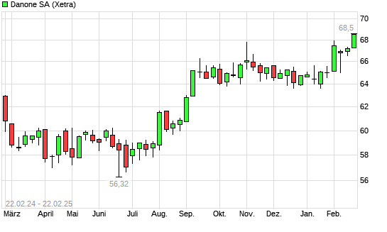 Mit dem Anstieg auf 68,30 EUR hat die Danone-Aktie (ISIN FR0000120644) am 21.02.2025 ein neues 3-Jahres-Hoch erreicht und damit den Kurs vom 20.02.2025 eingestellt.