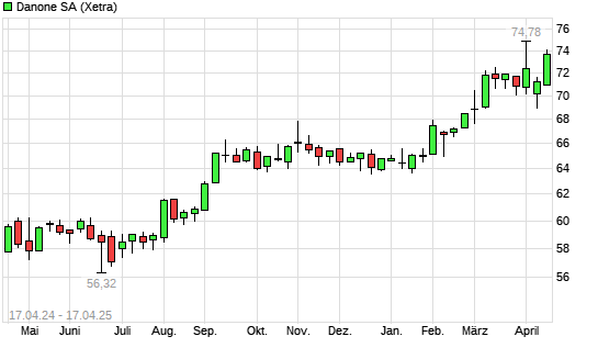 Mit dem Anstieg auf 73,70 EUR hat die Danone-Aktie (ISIN FR0000120644) am 16.04.2025 ein neues 5-Jahres-Hoch erreicht und damit den Kurs vom 03.04.2025 eingestellt.
